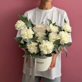 Шляпная коробка с белоснежными диантусами и эвкалиптом «лорен»