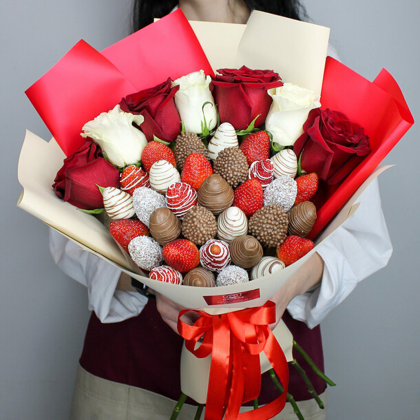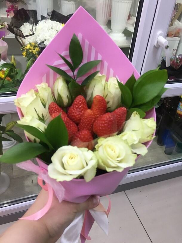 Прекрасный букет с клубникой! Выглядит аппетитно, на вкус девушке очень понравилось, обязательно ещё закажу у вас)