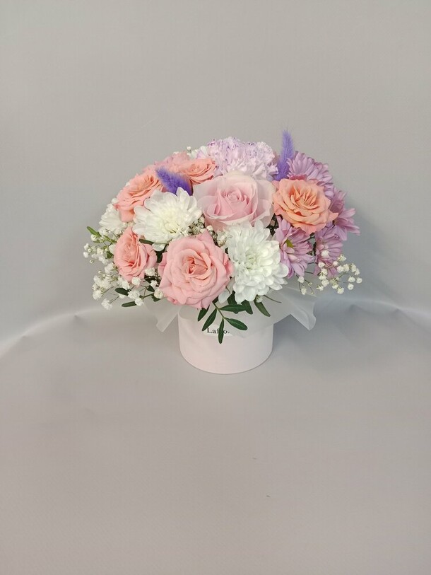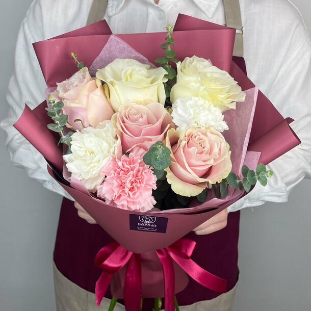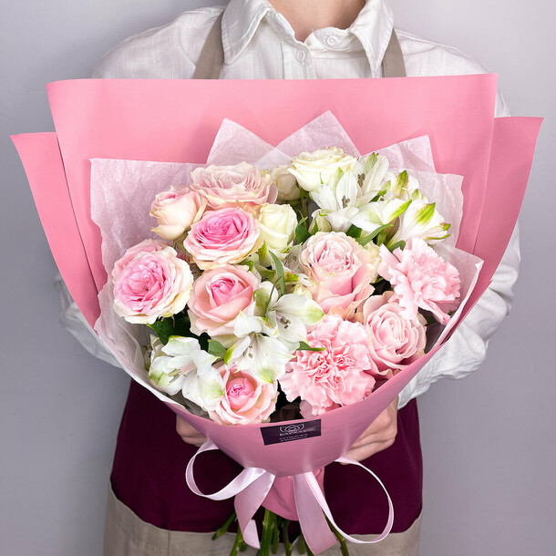 очень красивый и нежный букет получился. роза, гвоздика- бутоны упругие, хорошие.