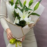 Букет из 5 разноцветных нежных тюльпанов с мимозой в матовой пленке