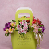 Букет из 5 разноцветных тюльпанов с мимозой в матовой пленке