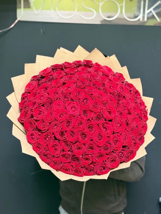 . Он состоит из 101 изысканной розы, которые создают непревзойденную красоту и чувственность. Упакован в стильную крафтовую бумагу, которая добавляет нотку оригинальности и природной простоты. Завершается букет атласной лентой, которая подчеркивает изысканность и шарм композиции. Этот букет станет идеальным подарком для особых людей и особых моментов в жизни.
