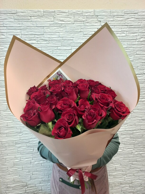 Хотите удивить любимую? подарите ей букет из 25 бордовых роз! моно букет из свежих местных цветов, упакованных в красивую упаковку.