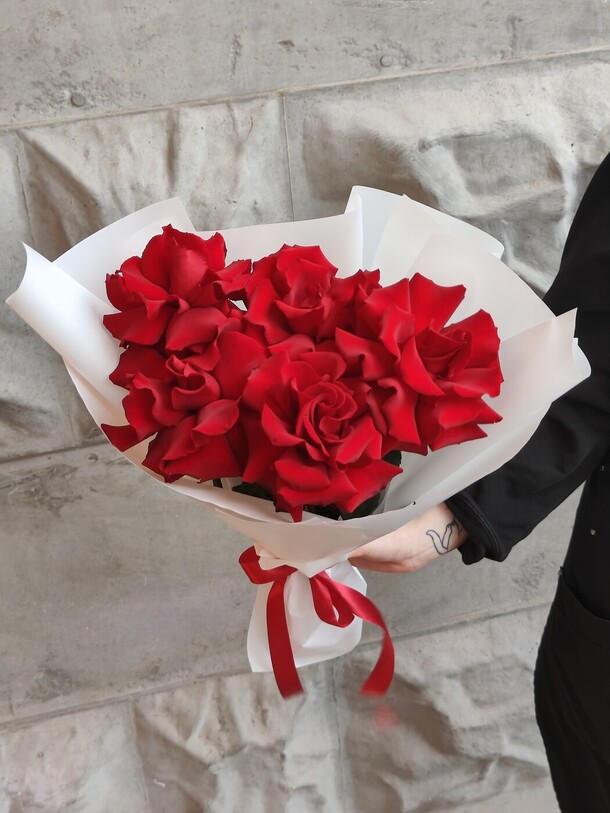 СОСТАВ: Роза - 5, Пленка корейская - 1, Лента атласная - 1