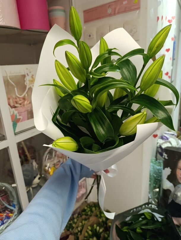 СОСТАВ: Альстромерия - 6, Лилия белая - 3, Упаковка - 1