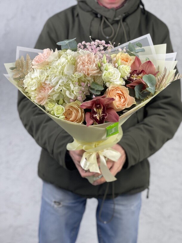 Букет с составом из рускуса, розы пионовидной, гвоздики, эвкалипта, орхидеи, папоротника, гортензии, хамелациума, лизиантуса, великолепный выбор для особого случая. Рускус добавляет нежную зелень, роза пионовидная и орхидея придадут букету изысканность и роскошь, гвоздика добавит шарма, а эвкалипт и папоротник придадут композиции структуру и объем. Гортензия придаст букету изысканный и романтичный вид, а лизиантус добавит свежести и яркости. Упаковка включает дизайнерскую упаковку и ленту, которые добавляют особую изысканность и завершенность букету, делая его великолепным подарком для особого человека.