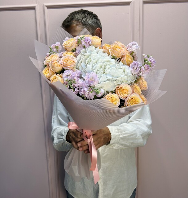 Нежный, ароматный букет из маттиолы и кустовой розы, прекрасное сочетание цветов и фактур