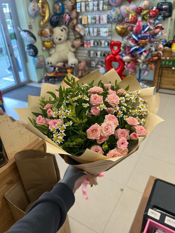 Этот букет — гармония мягких оттенков и природной красоты. Сочетание кремовых роз и ромашек создает ощущение уюта, тепла и искренности. Он станет прекрасным символом заботы и нежности, идеальным подходом для выражения самых теплых чувств.