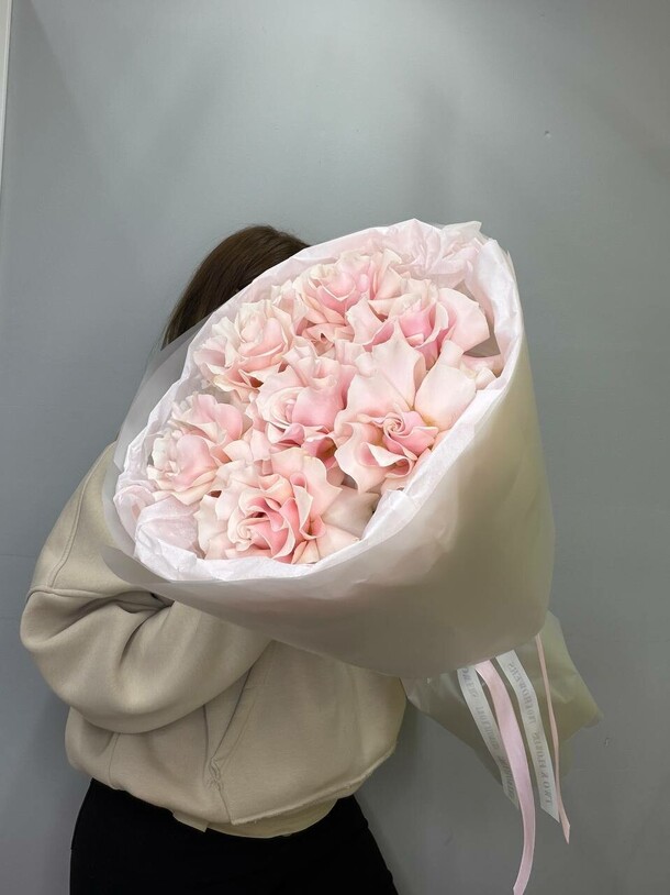 Этот нежный букет покоряет своим мягким пастельным оттенком. Розовые розы, словно облака, дарят ощущение легкости и романтики. Такой букет станет прекрасным символом любви и заботы, создавая теплую атмосферу в любом моменте жизни.