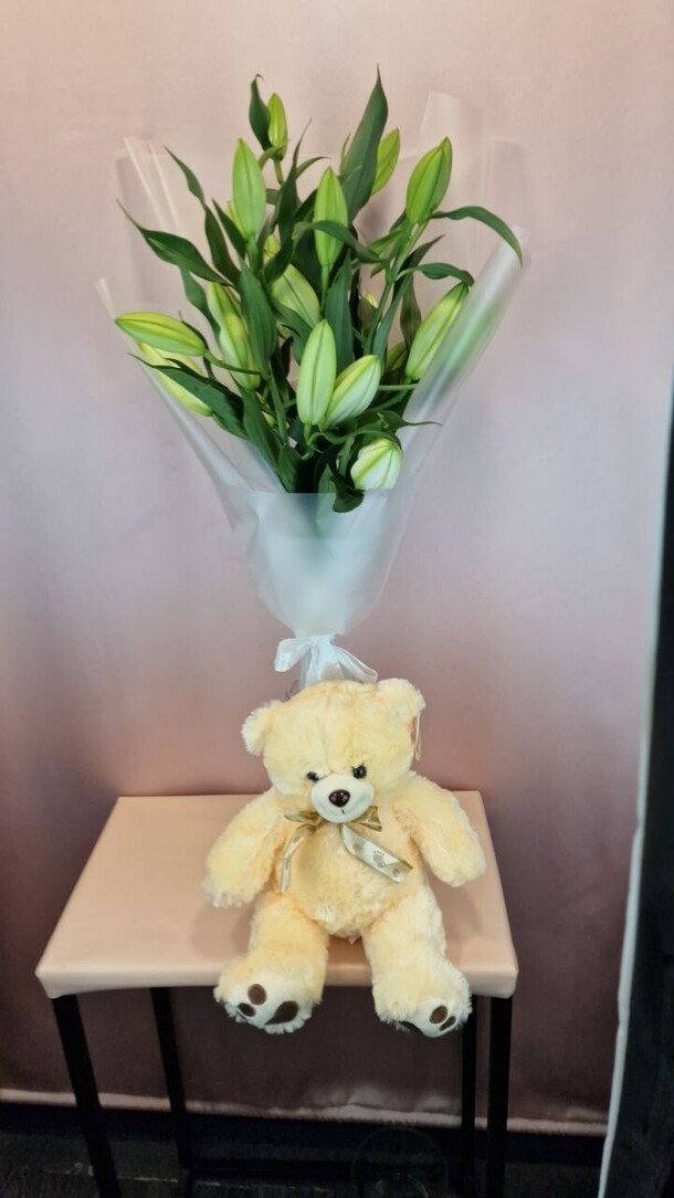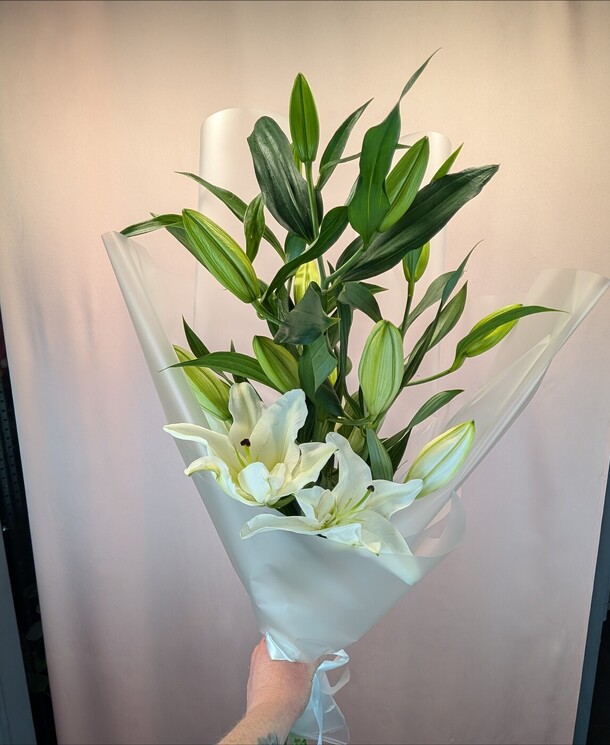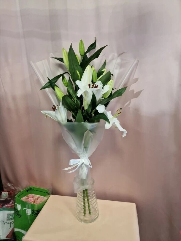 Этот элегантный букет состоит из трех изящных лилий, олицетворяющих чистоту и нежность. Они красиво упакованы в дизайнерскую упаковку, подчеркивающую их изысканный вид. Завершающий штрих - атласная лента, добавляющая изысканности и шарма этому великолепному букету. Этот подарок станет прекрасным символом вашей заботы и восхищения.