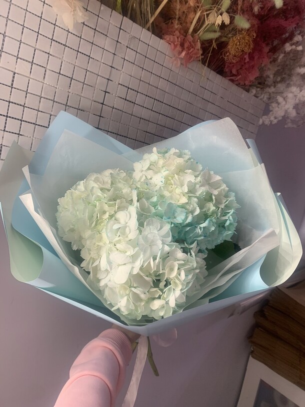 Букет, состоящий из 5 прекрасных гортензий (гидрангий) в дизайнерской упаковке, создаст нежное и изысканное настроение. Гортензии символизируют благополучие, изобилие и любовь, что делает этот букет отличным подарком для любого случая. Феерические соцветия гортензий приятно поразят взгляд и подарят радость и умиротворение.