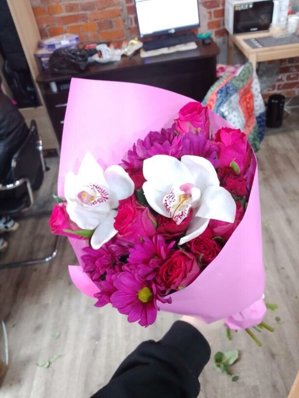 СОСТАВ: Роза - 9, Альстромерия - 3, Гиперикум - 3, Орхидея цимбидиум - 2, Фрезия - 2, Пленка матовая - 1