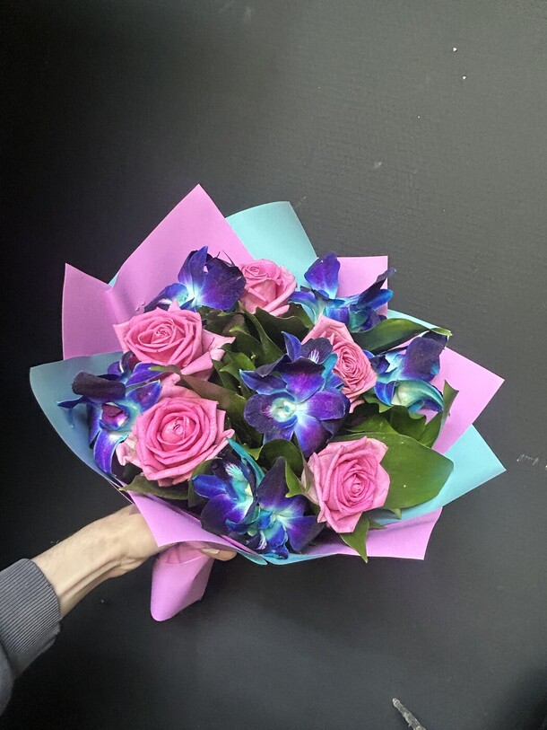 Букет живых цветов из космических орхидей и розовых роз 11 шт арт. 1310211
