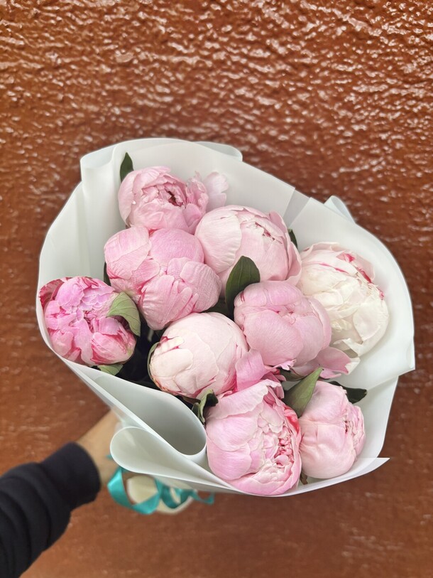 СОСТАВ: Пион - 9, Авторская упаковка - 1, Лента атласная - 1