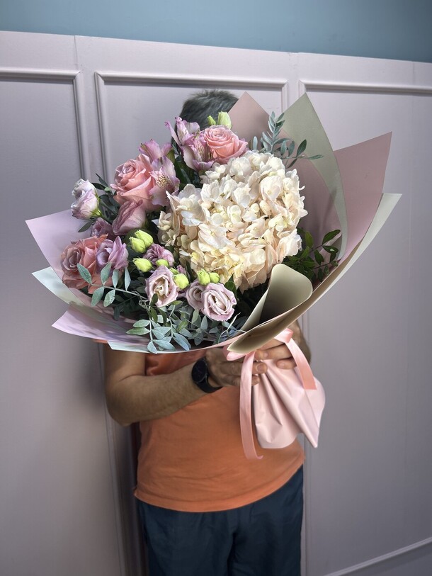 Букет из роз, эустомы и гортензии