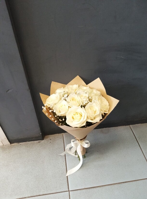 Этот букет как нежный шепот любви, пробуждающий самые теплые чувства. В нем изысканно сочетаются белые розы и легкая вуаль гипсофилы. Такой букет идеально подойдет для того, чтобы рассказать о своих чувствах без слов, передать трепет, нежность и заботу.