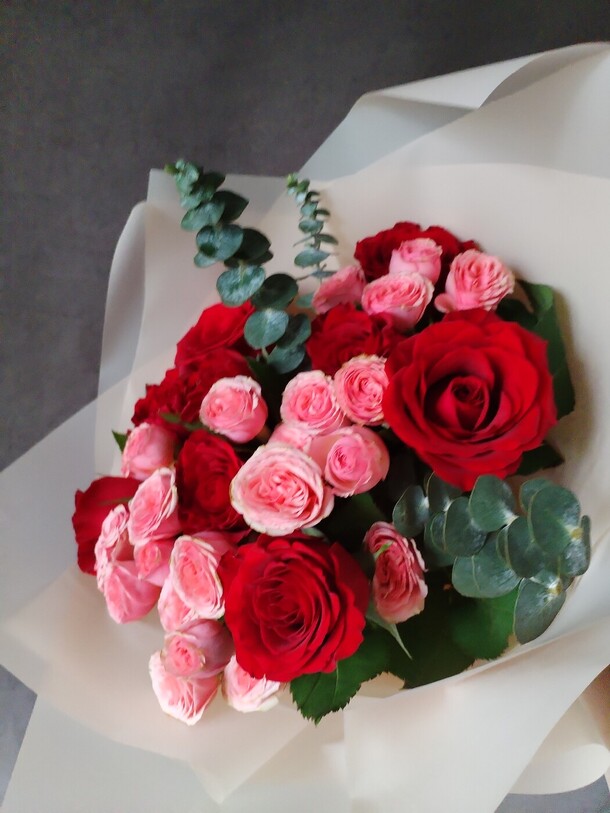 Этот утонченный букет состоит из красивых роз и роз пионовидной, которые символизируют любовь и нежность. Дополнительно к цветам добавлены веточки эвкалипта, придающие композиции особую свежесть и аромат. Букет упакован в пленку, что сохраняет его свежесть и красоту долгое время. Этот букет станет прекрасным подарком для любого праздника или просто чтобы порадовать близкого человека.