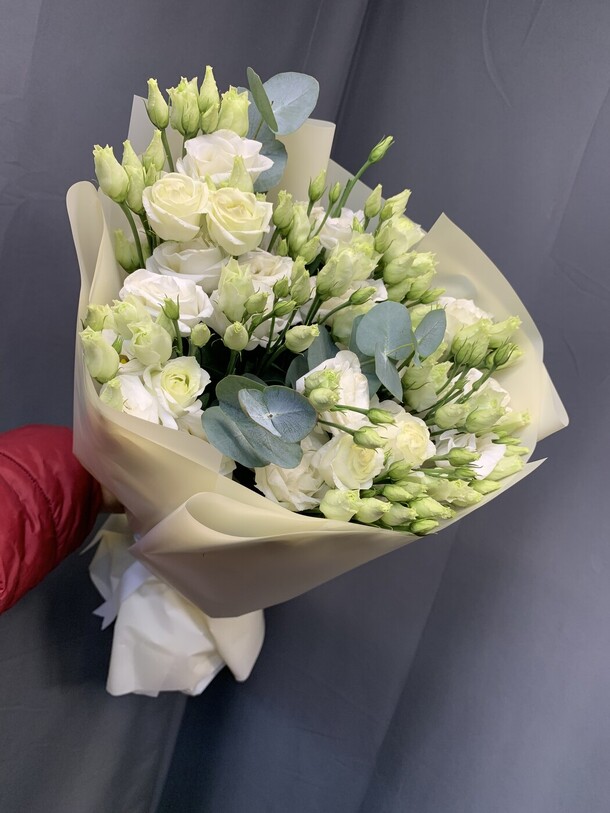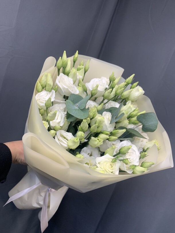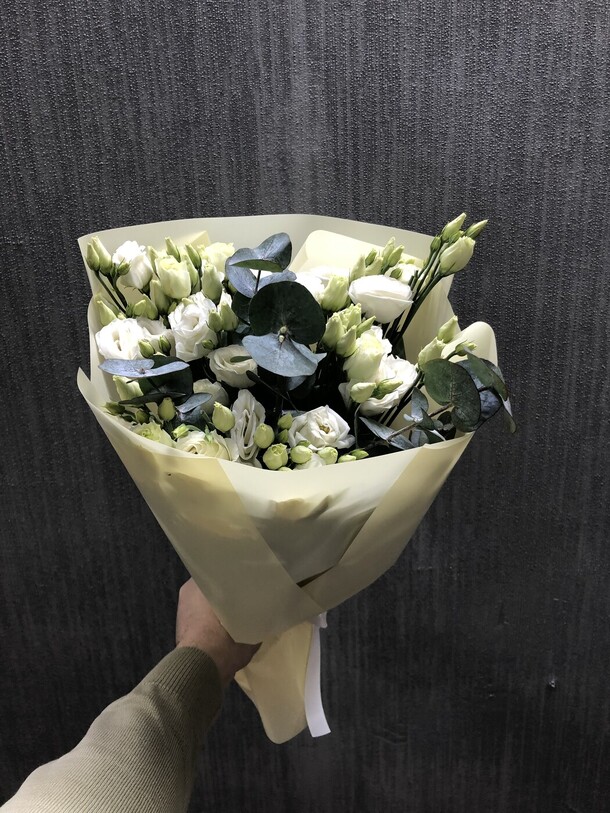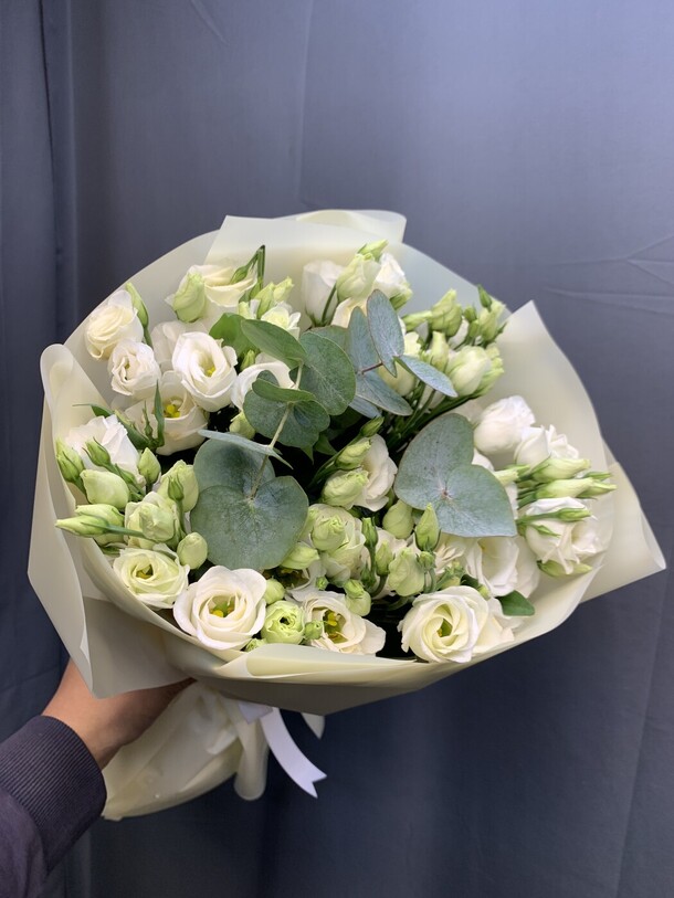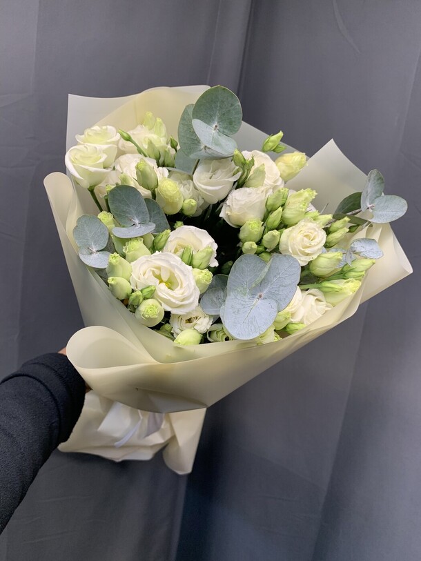 Этот изящный букет из лизиантуса (эустома) и свежего эвкалипта поражает своей нежной красотой. Он упакован с любовью в стильную упаковку, украшенную лентой и дополненный открыткой, которая поможет вам выразить свои чувства и пожелания. Этот букет станет великолепным подарком для любого случая и порадует получателя своим восхитительным видом.