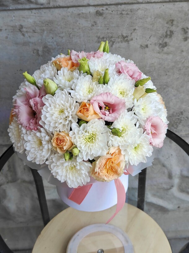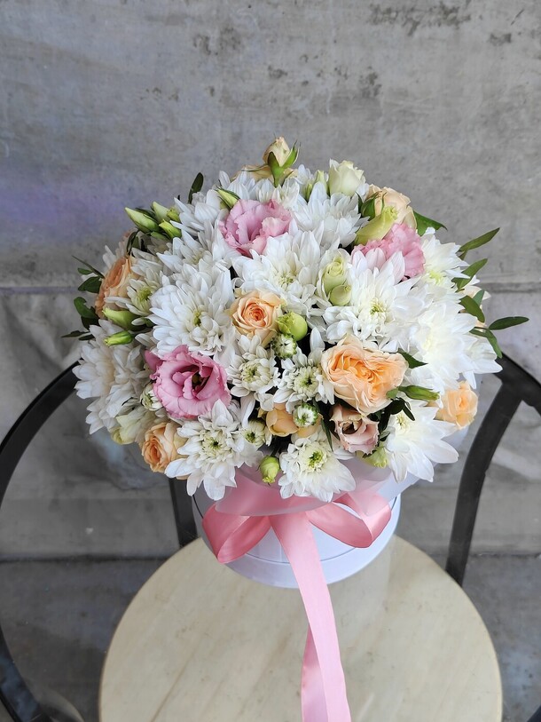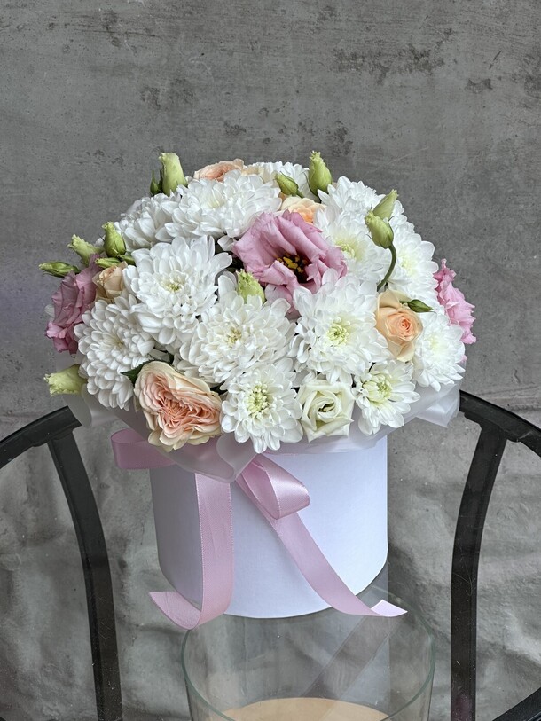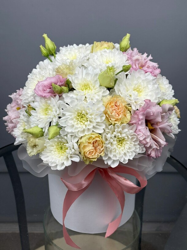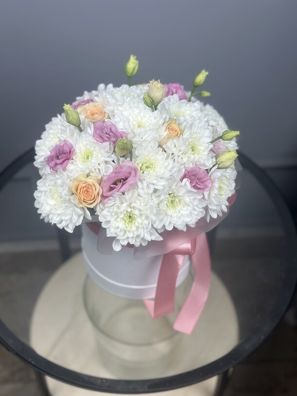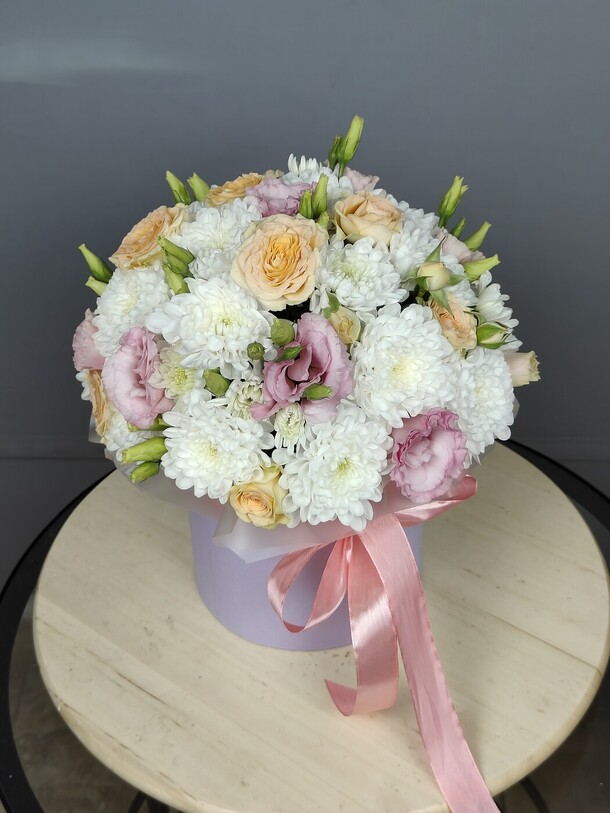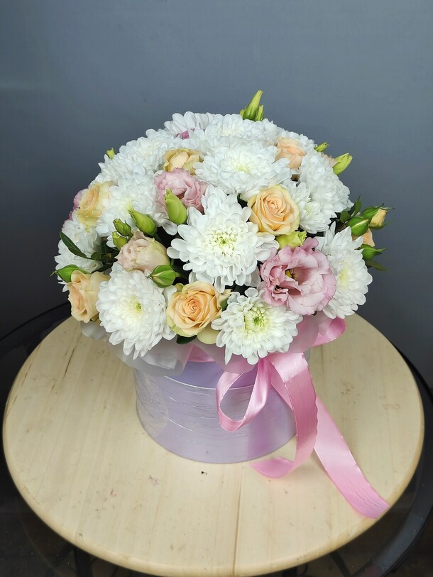 Нежная композиция с кустовыми хризантемами белого оттенка , чайными розами и бархатистой кудрявой эустомой. Цветы в коробке помещены в специальную флористическую основу , не требует особого ухода