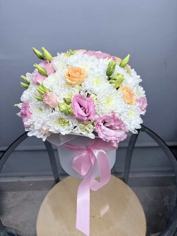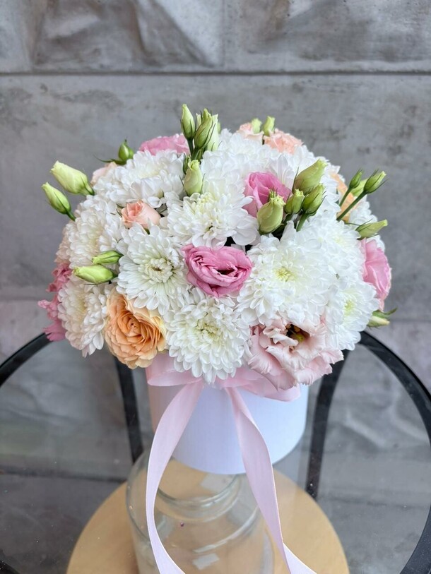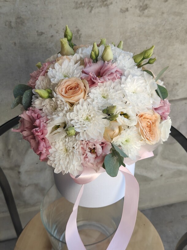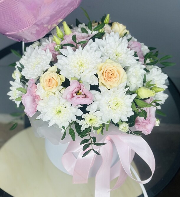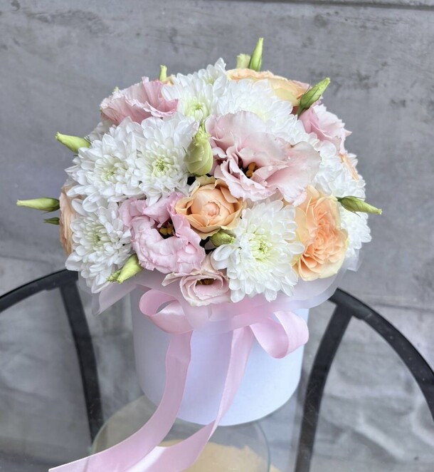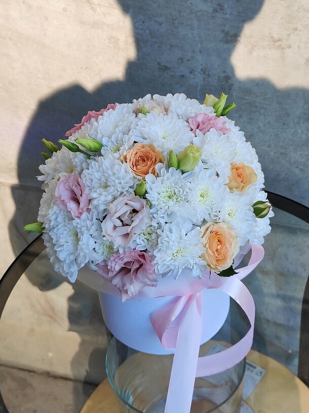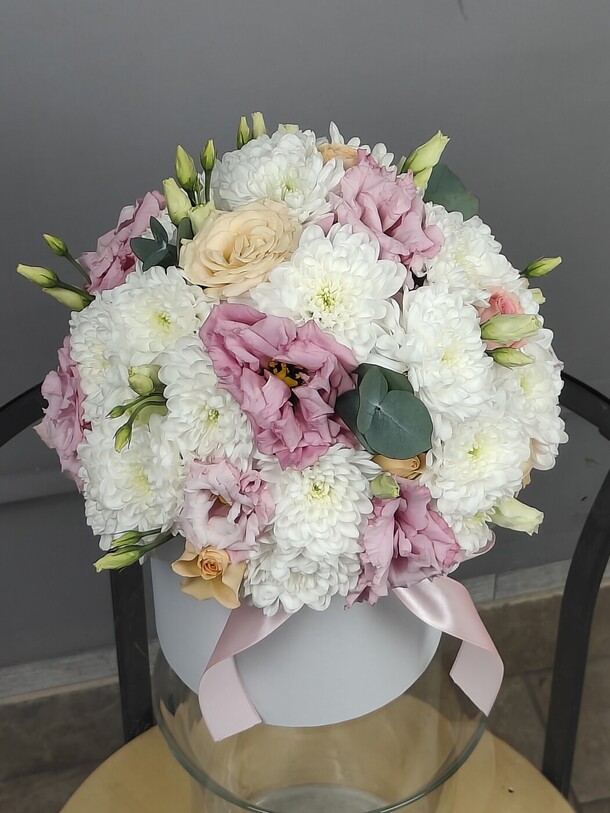 Нежная композиция с кустовыми хризантемами белого оттенка , чайными розами и бархатистой кудрявой эустомой. Цветы в коробке помещены в специальную флористическую основу , не требует особого ухода