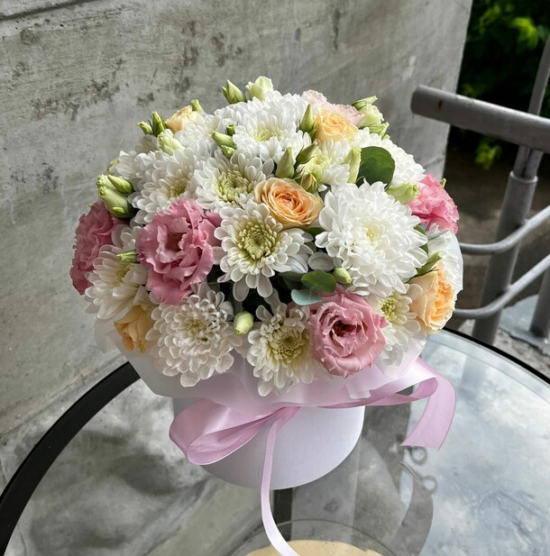 СОСТАВ: Лизиантус (Эустома) - 6, Чайная Роза крем де ла крем - 3, Хризантема кустовая - 3, Фисташка - 3, Шляпная коробка - 1, Оазис - 1, Лента атласная - 1