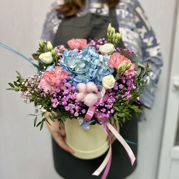 Коробка с голубой гортензией и диантусами арт. 1407583