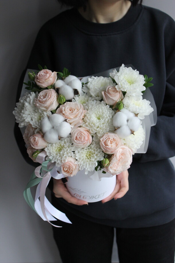 СОСТАВ: Роза пионовидная кустовая - 3, Хлопок - 3, Лента - 3, Хризантема кустовая - 2, Фисташка - 2, Шляпная коробка - 1