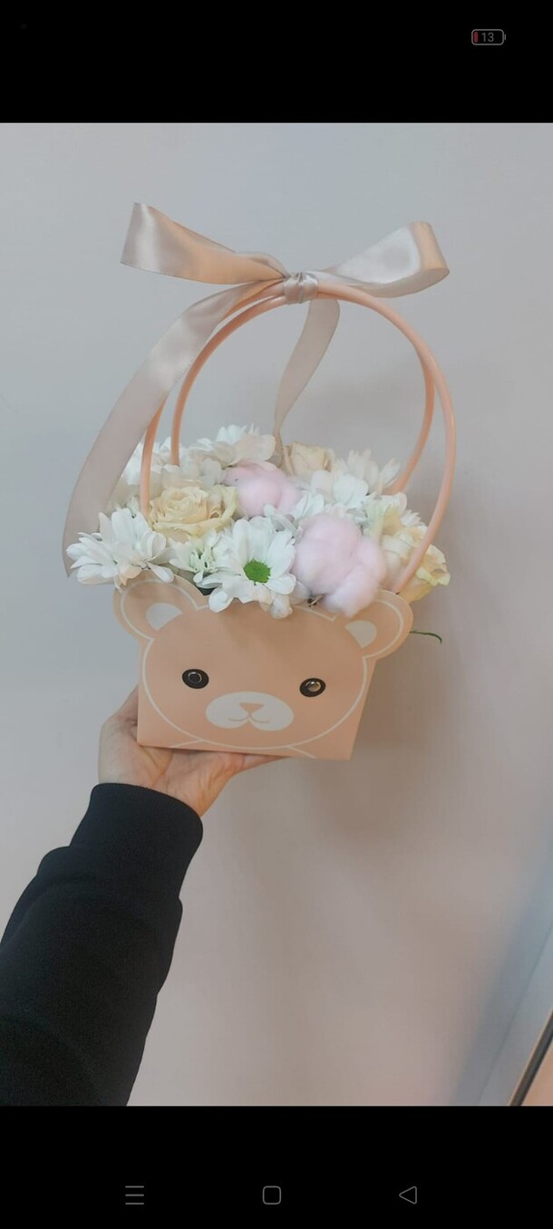 Милашка 2, милая небольшая цветочная композиция в розовой сумочке мишке.