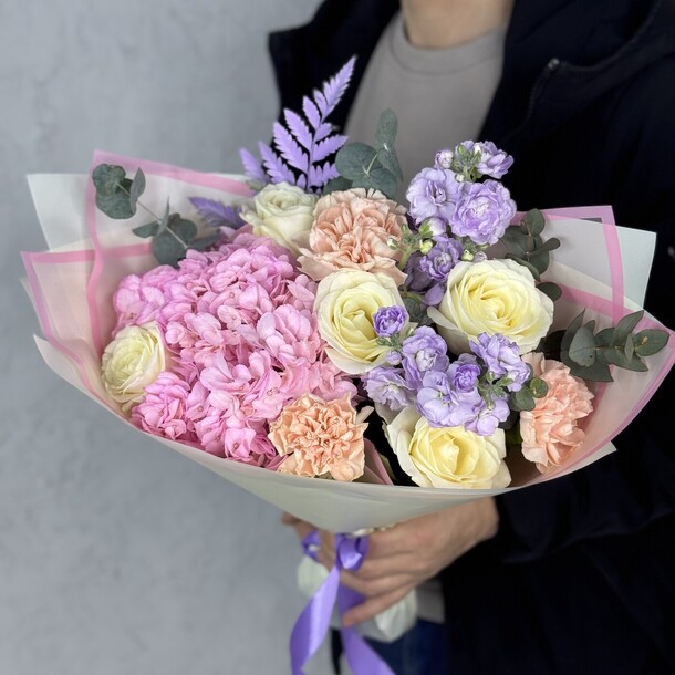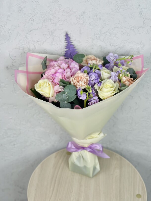 СОСТАВ: Роза белая - 5, Эвкалипт - 5, Диантус - 3, Маттиола - 2, Гортензия - 1, Папоротник - 1, Дизайнерская упаковка - 1, Лента - 1