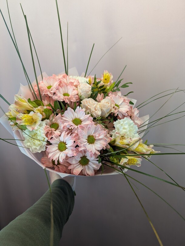 СОСТАВ: Альстромерия - 3, Диантус - 3, Хризантема кустовая - 3, Роза кустовая - 1, Зелень - 1, Дизайнерская упаковка - 1
