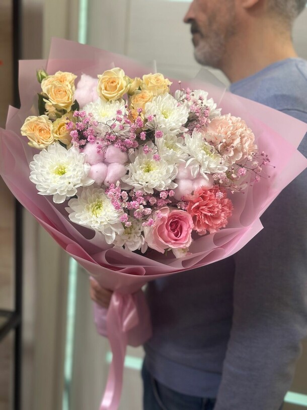Этот изысканный букет состоит из роз кустовых, диантусов, хризантем кустовых, гипсофилы и роз пионовидных. Каждый цветок в нем ярко выражает свою красоту и нежность. Букет упакован в корейскую пленку, украшен фетром и завязан атласной лентой, что делает его еще более привлекательным и стильным подарком.