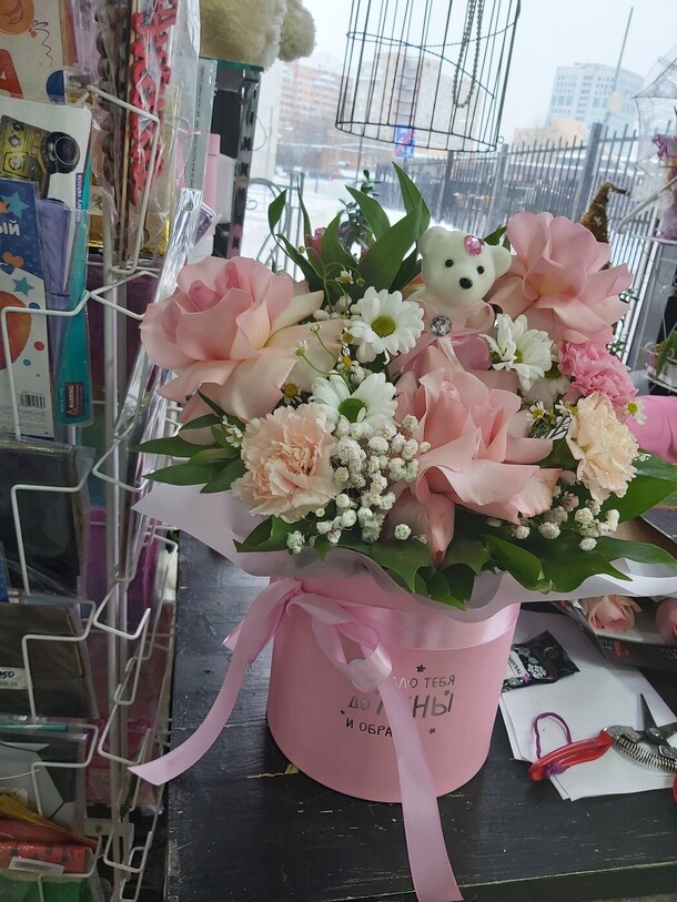 СОСТАВ: Рускус - 7, Роза французская - 3, Альстромерия - 3, Гвоздика - 3, Хризантема - 2, Лента атласная - 2, Гипсофила - 1, Танацетум - 1, Шляпная коробка - 1
