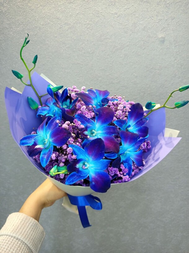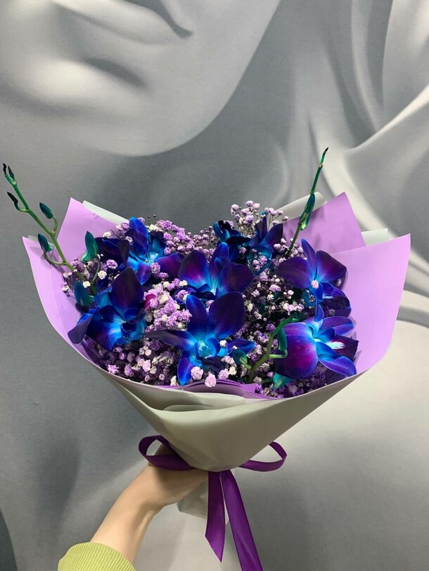 Этот изысканный букет состоит из элегантных орхидей и воздушных гипсофил. Орхидеи символизируют красоту и изящество, а гипсофила добавляет легкости и нежности композиции. Букет упакован в корейскую бумагу, создавая элегантный и изысканный вид. Он идеально подойдет в качестве подарка для особого человека или для создания романтического настроения.