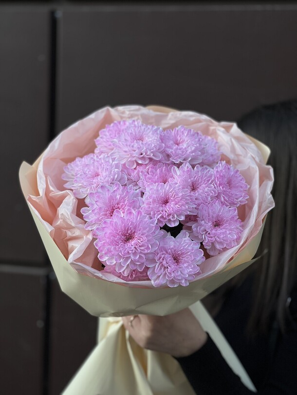 Нежный и стильный букет с кустовыми хризантемами в упаковке с дизайнерским оформлением. Яркие цвета и оригинальное оформление сделают этот букет незабываемым.