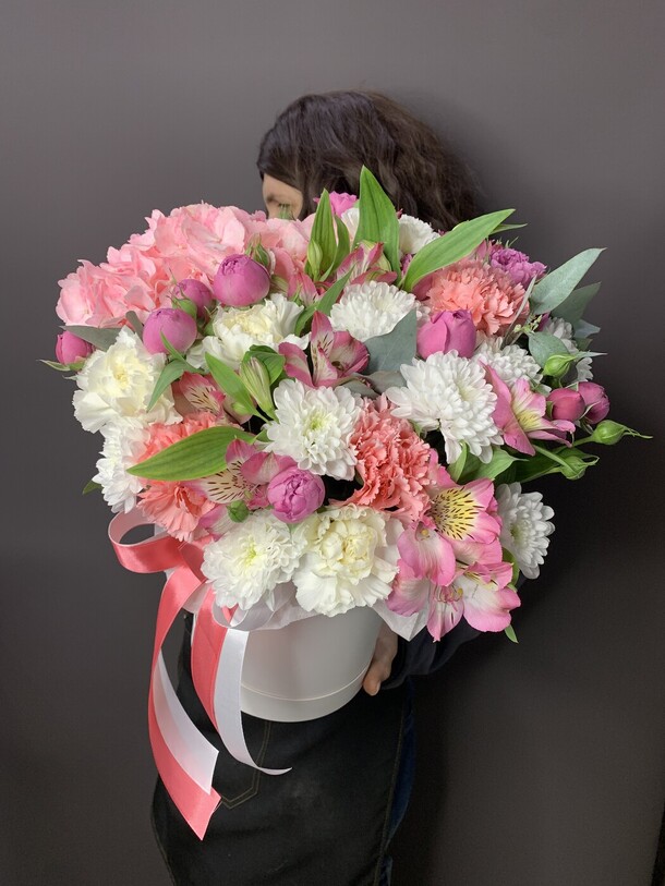 Ярка коробка из разных ароматных цветов порадует получательницу на любой праздник . Стойка стильная и объемная композиция