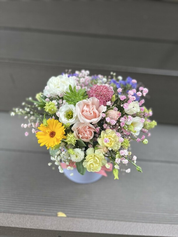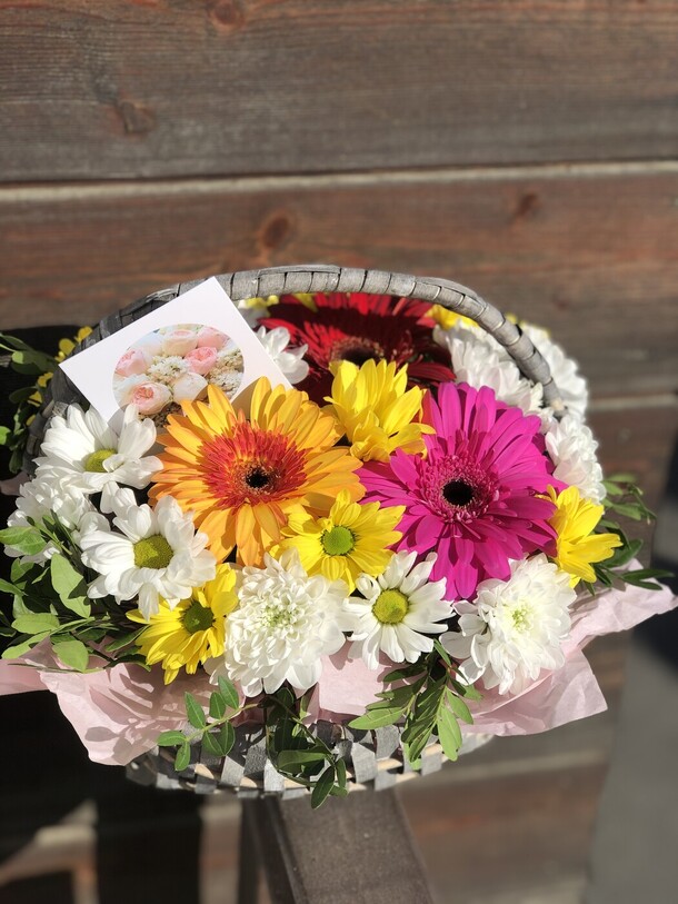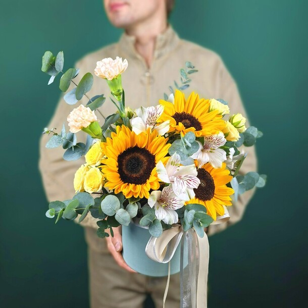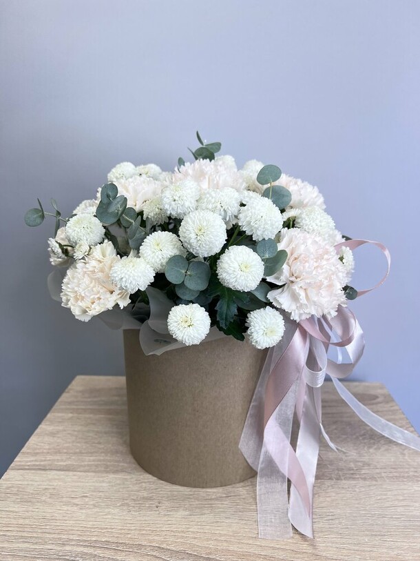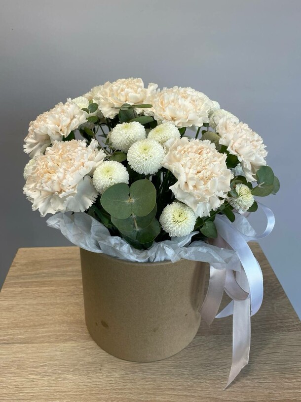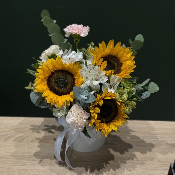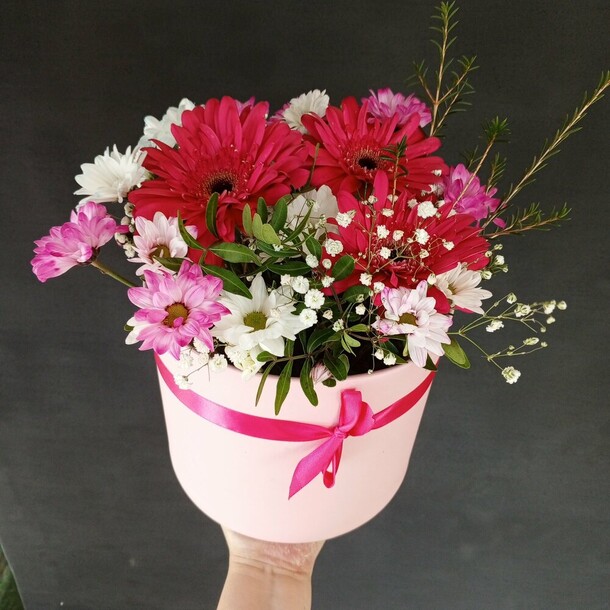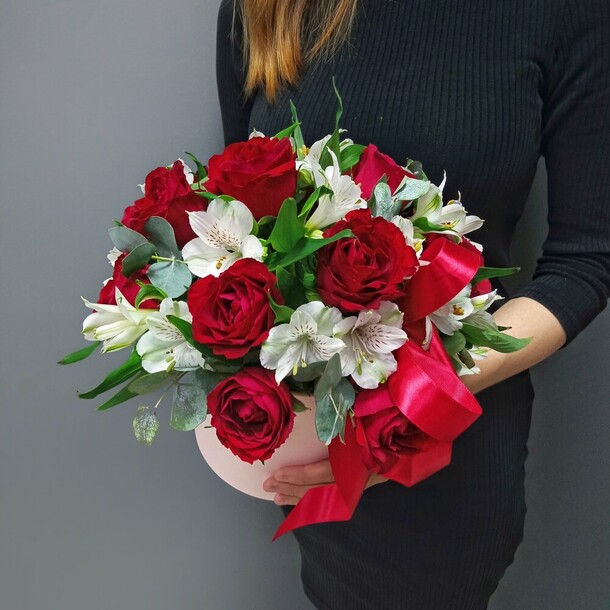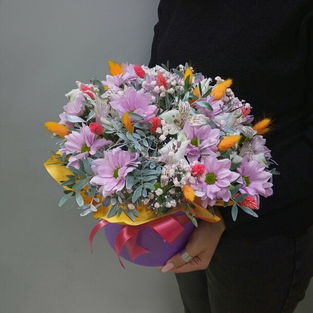 Красивый яркий небольшой букетик в коробке (жаль, что коробка белая, а не как на фотографии цветочного магазина). Понравился.