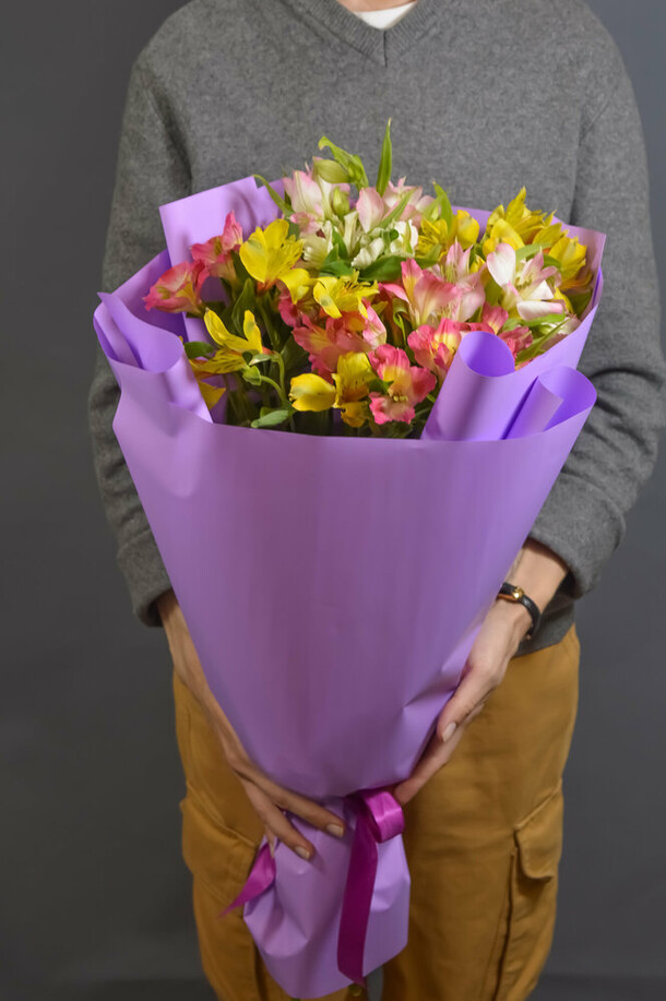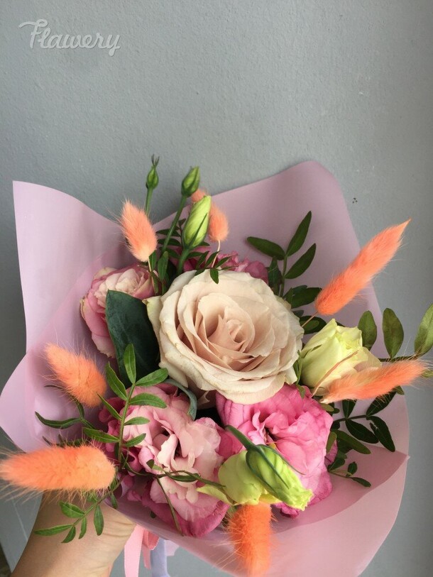 Эустомы заменили по согласованию со мной на альстромерии, в целом милый мини букетик, но цветы прям на последнем издыхании