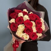 1. Товар не соответствует фото. Букет выглядит иначе, упаковка дешевая, одна роза была мятой.
