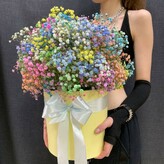 Композиция в шляпной коробке из хризантем и раффаэлло