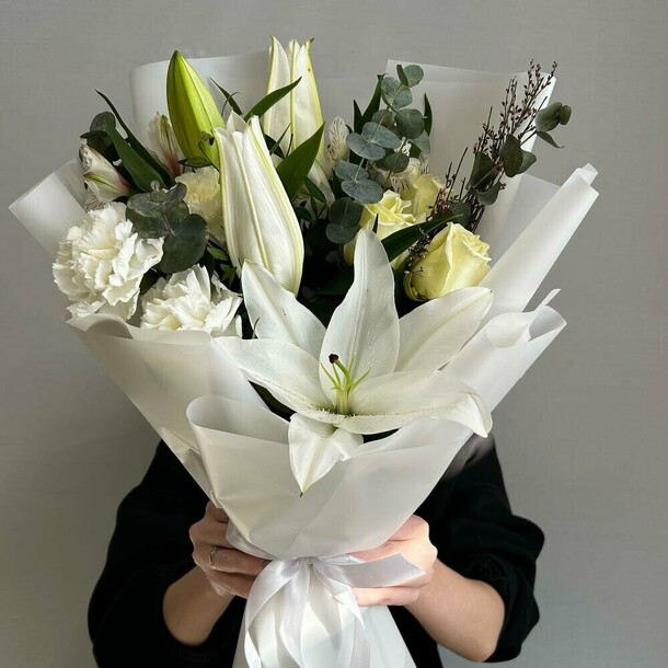 С описанием совпадает, единственный вопрос к фото , на фото есть эвкалипт а в составе букета его нету.