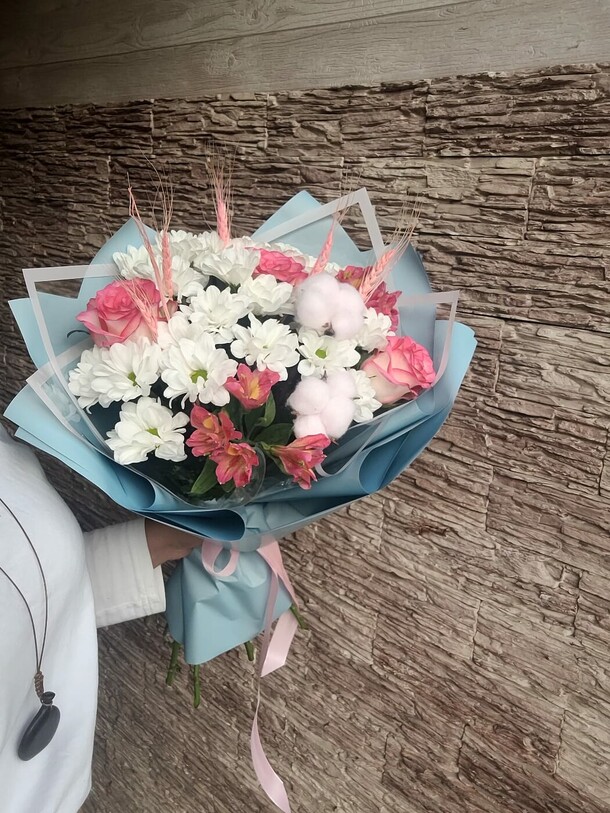 Букет конечно красивый, но цветы совсем не первой свежести, некоторые уже начали вянуть. Обидно, это был подарок маме