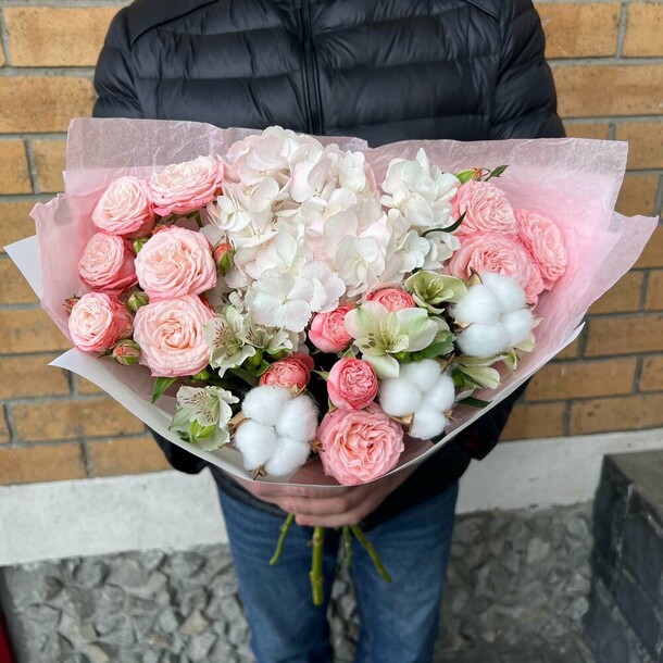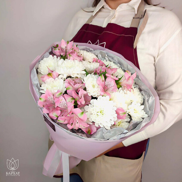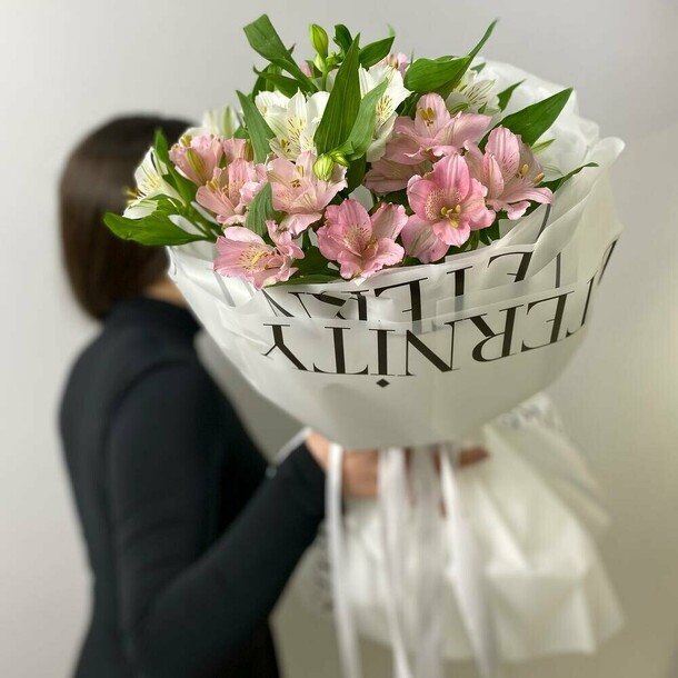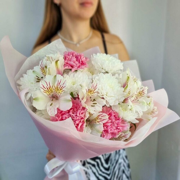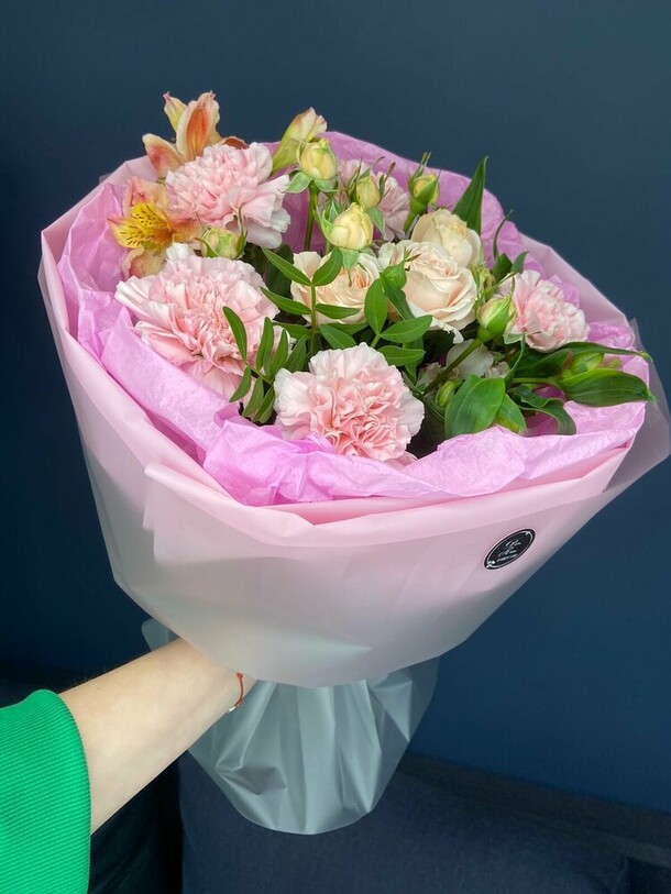 Красивый букет, полностью соответствует фото. Доставка вовремя. Девушка очень довольна — а это самое главное!