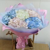 Цветы совершенно несвежие, гортензия уже полумертвая, завяла. Сама гортензия не по центру букета, а приплюснута, выглядит неэстетично. Гипсофилы разноцветные, портят букет, не как на товарном фото. В общем и целом букет не соответствует тому, что представлен на сайте, и цвет букета, и оформление, и сборка, и размеры.