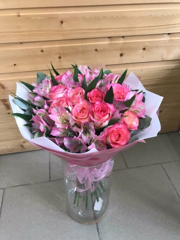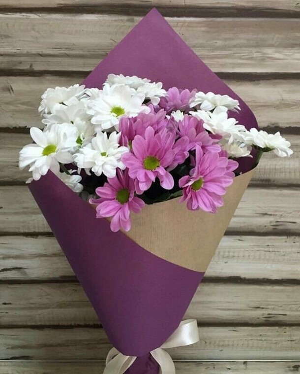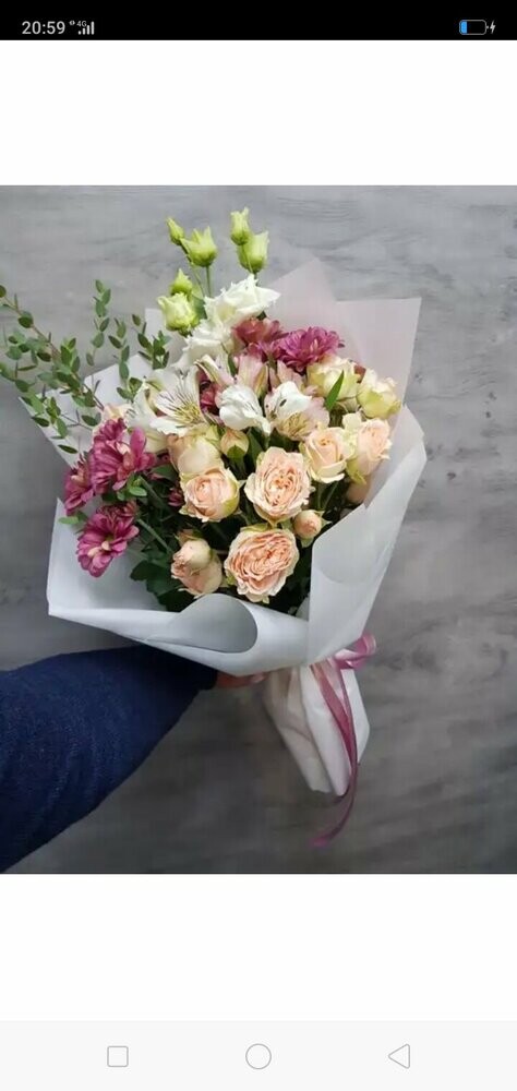 Свежие цветы, как на фото, быстрая доставка, вложили записку по просьбе, спасибо! Цена и качество соответствует, рекомендую! На фото букет уже без упаковки :)
