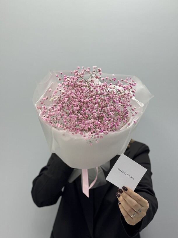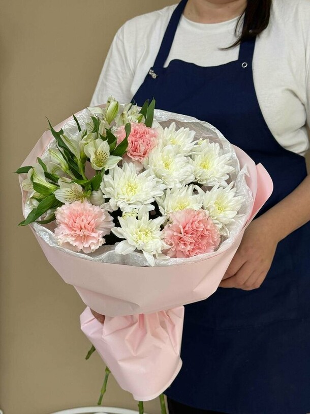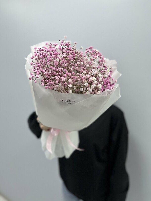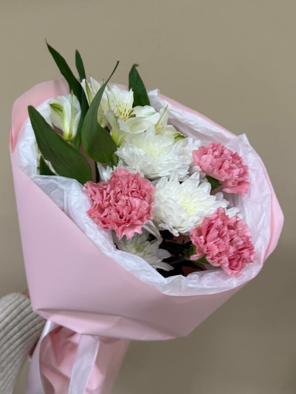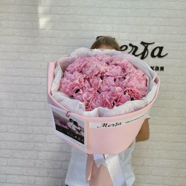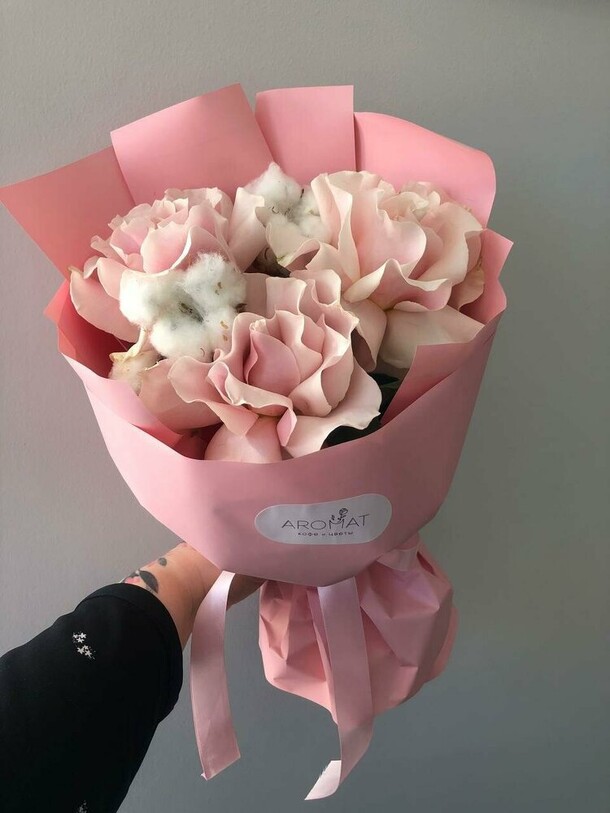 Букет не свежий. На фото отличается от вида вживую.Доставку задержали на час.