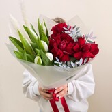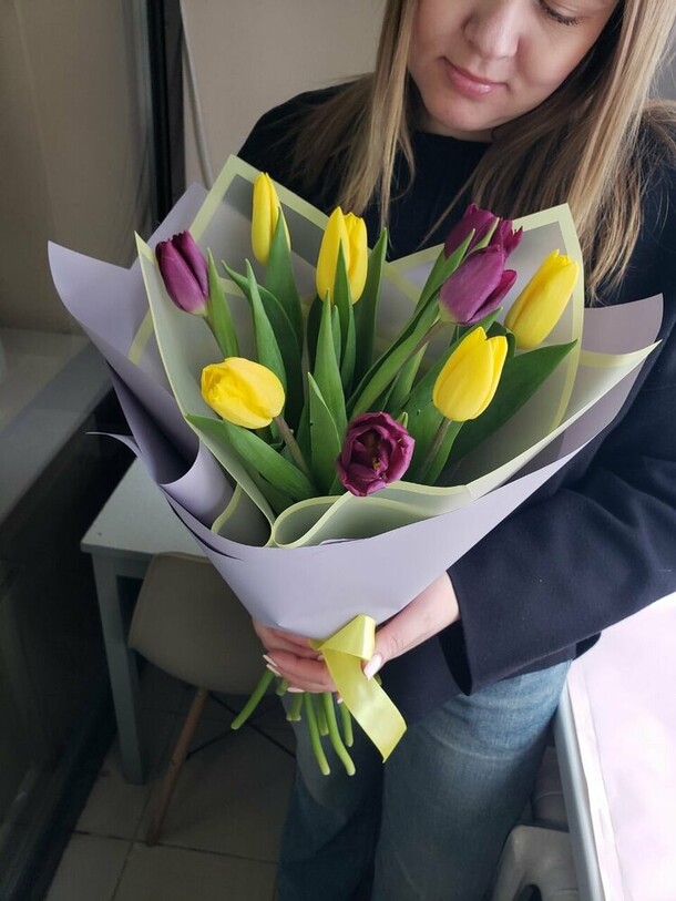 Букет красиво оформлен. Немного беспокоит состояние фиолетовых тюльпанов, они выглядят устало. Посмотрим, как будут стоять. В целом, впечатления приятные