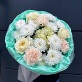 Светлый букет из роз, альстромерии, гвоздики, хризантемы, лимониума