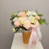 Сборный букет живых цветов из хризантем, гипсофил и белой розы, арт: 1794