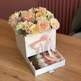 Шкатулка из сезонных цветов с клубникой в шоколаде «ланеста»
