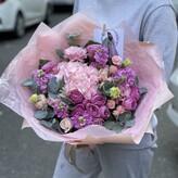 Нежный букет с гортензией и пионовидными розами